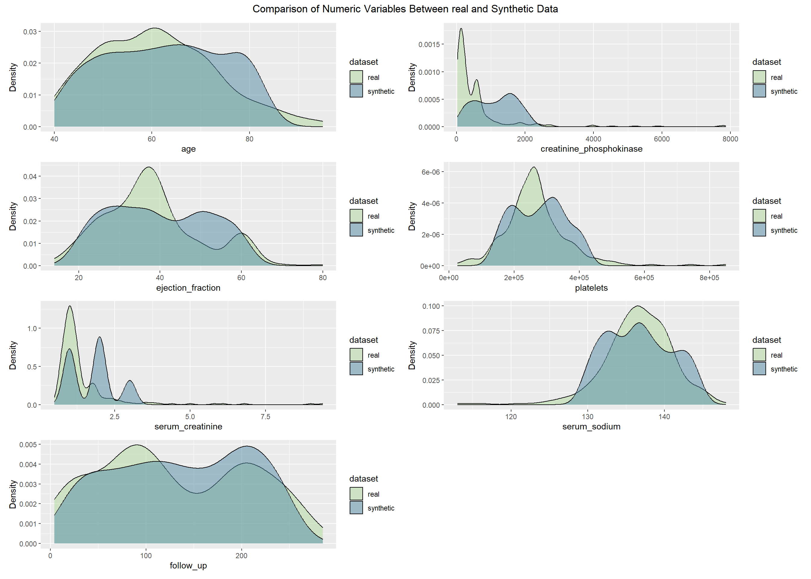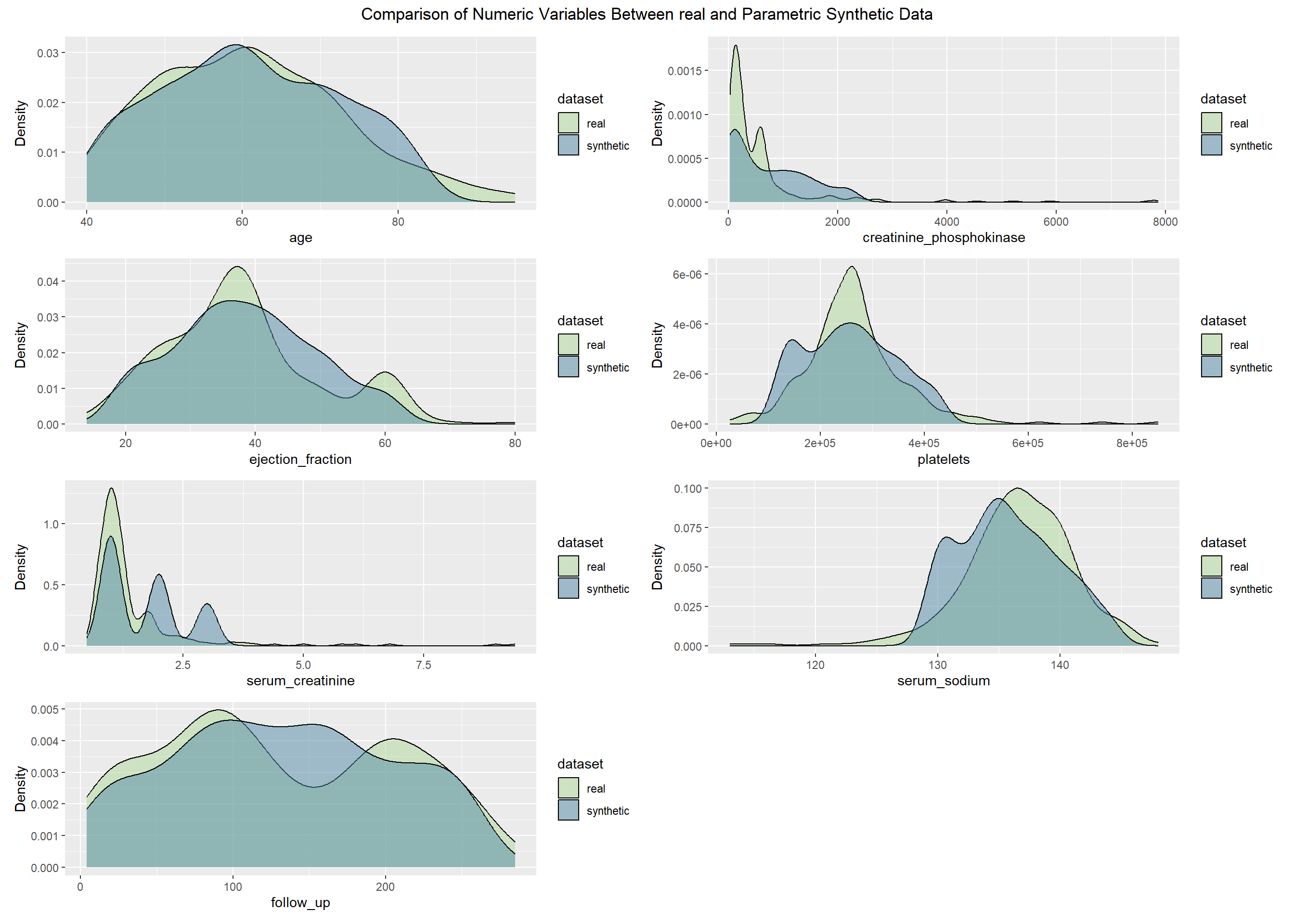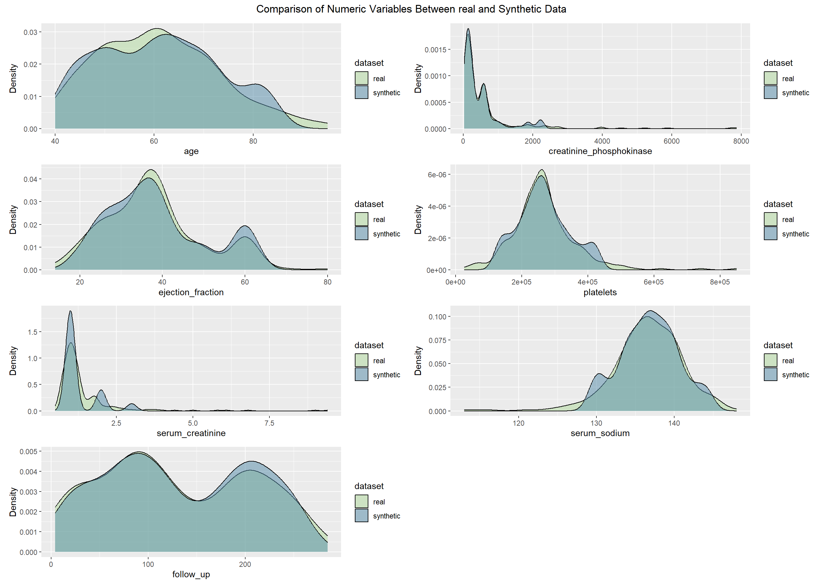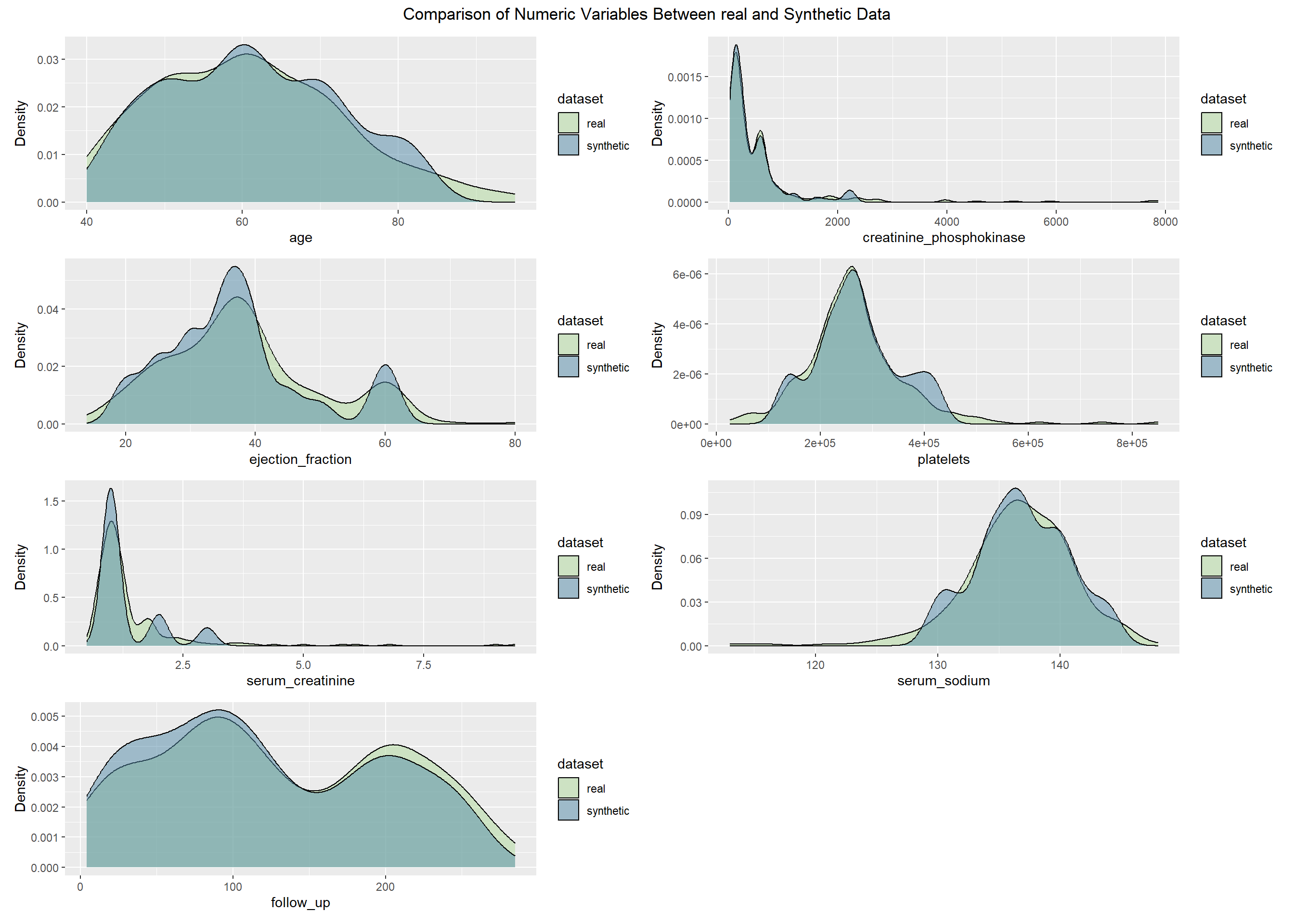 This project evaluates the quality of synthetic datasets derived from the Heart Failure Clinical Records data (299 patients, 13 variables). Our goal is to determine how well different generation strategies reproduce the statistical properties and analytic value of the original data while protecting privacy. We generate synthetic data using four approaches: (1) parametric imputation (MICE), (2) non-parametric imputation (CART via MICE), (3) distribution-driven synthesis (synthpop), and (4) metadata-guided rules. We then compare each synthetic dataset with the real data across three dimensions: