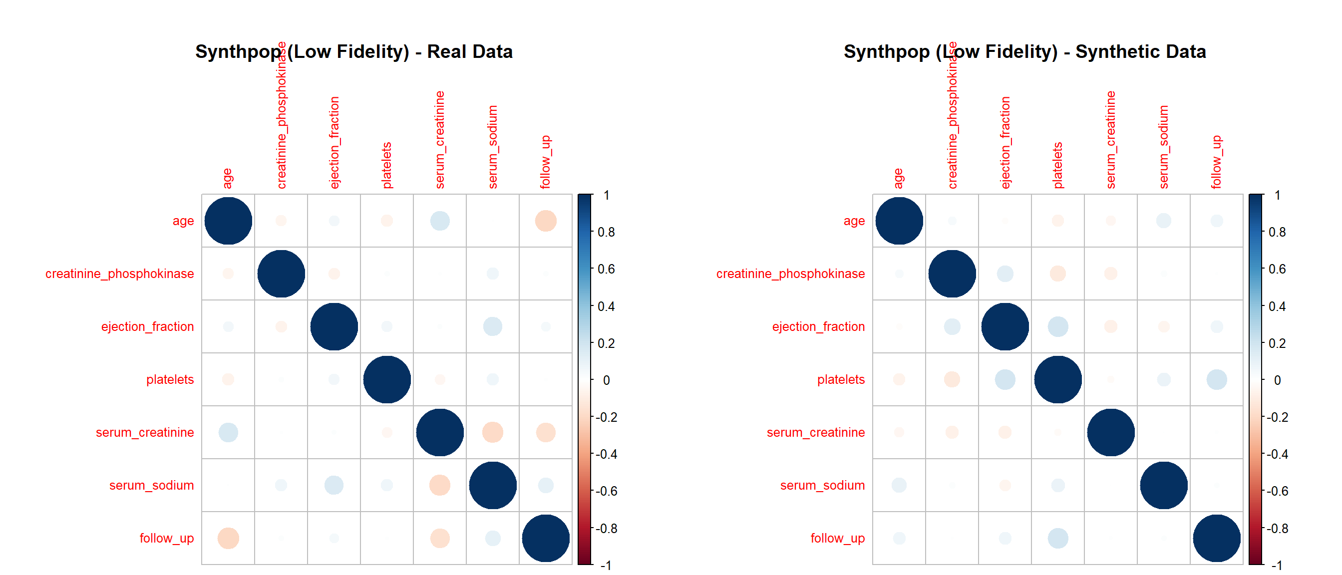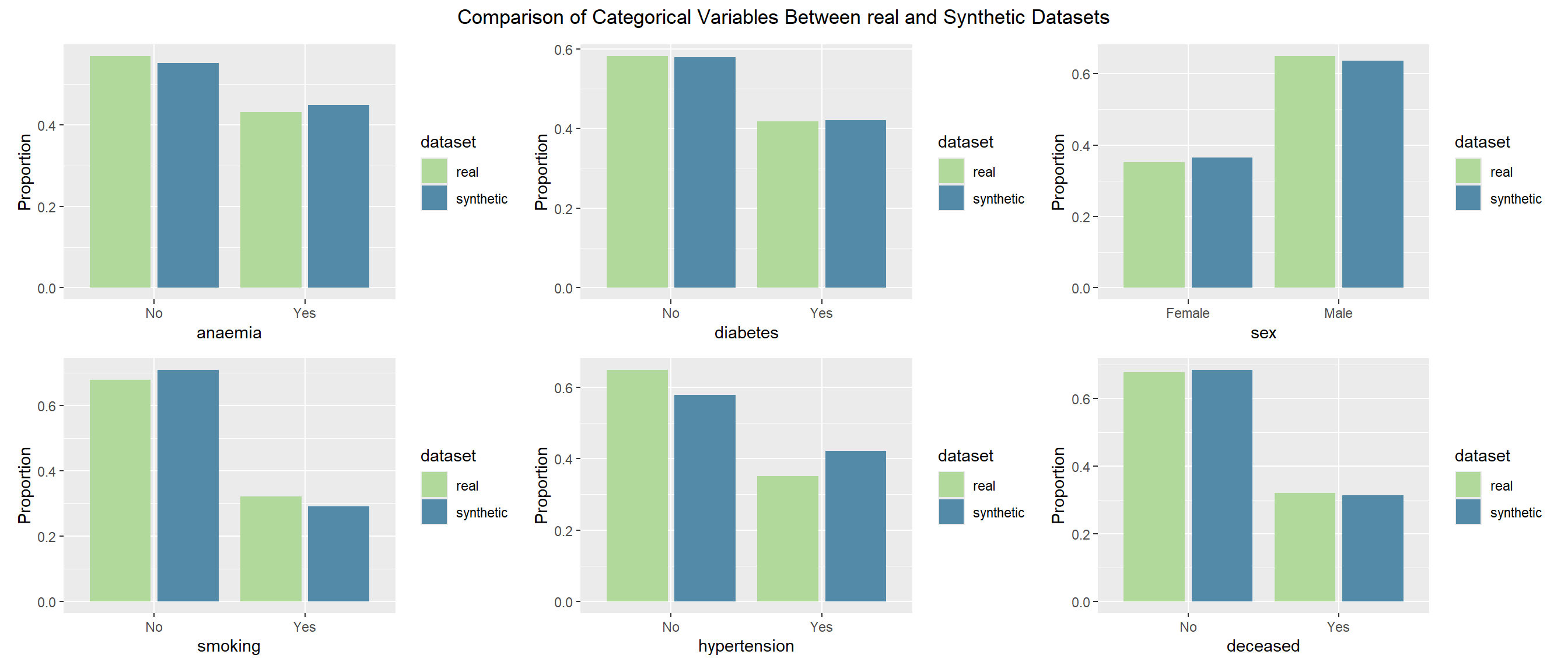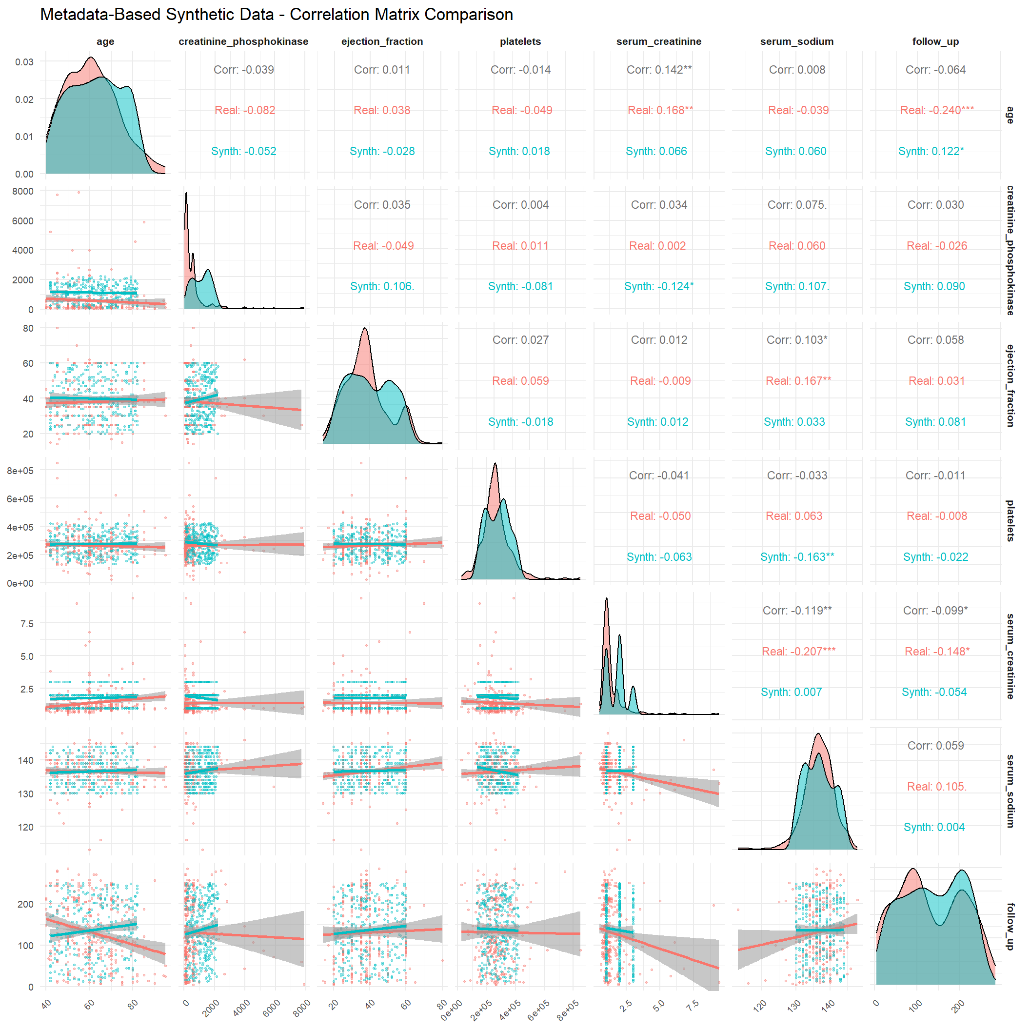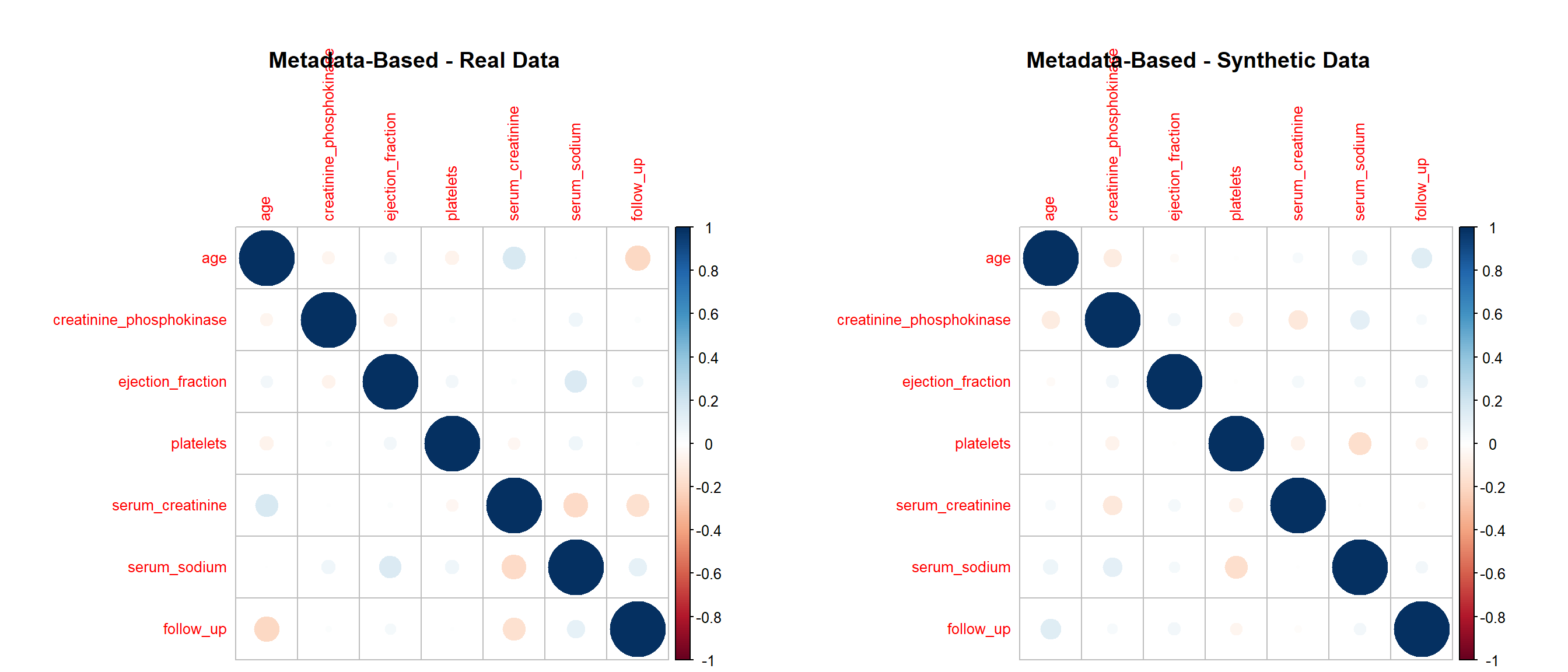 This project evaluates the quality of synthetic datasets derived from the Heart Failure Clinical Records data (299 patients, 13 variables). Our goal is to determine how well different generation strategies reproduce the statistical properties and analytic value of the original data while protecting privacy. We generate synthetic data using four approaches: (1) parametric imputation (MICE), (2) non-parametric imputation (CART via MICE), (3) distribution-driven synthesis (synthpop), and (4) metadata-guided rules. We then compare each synthetic dataset with the real data across three dimensions: