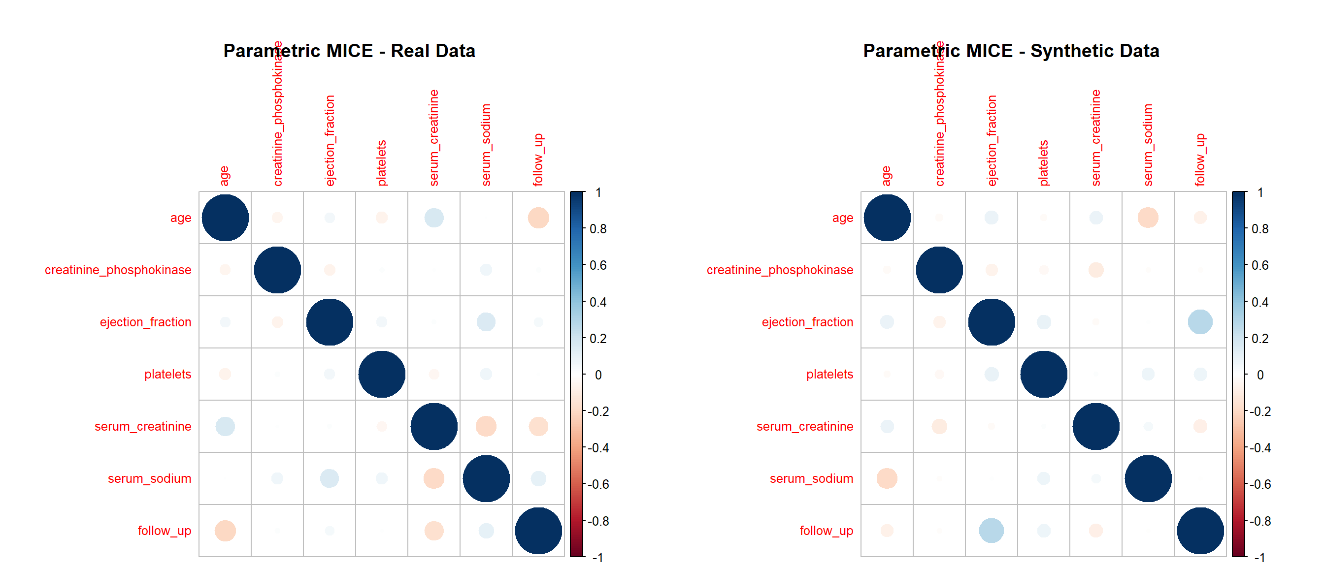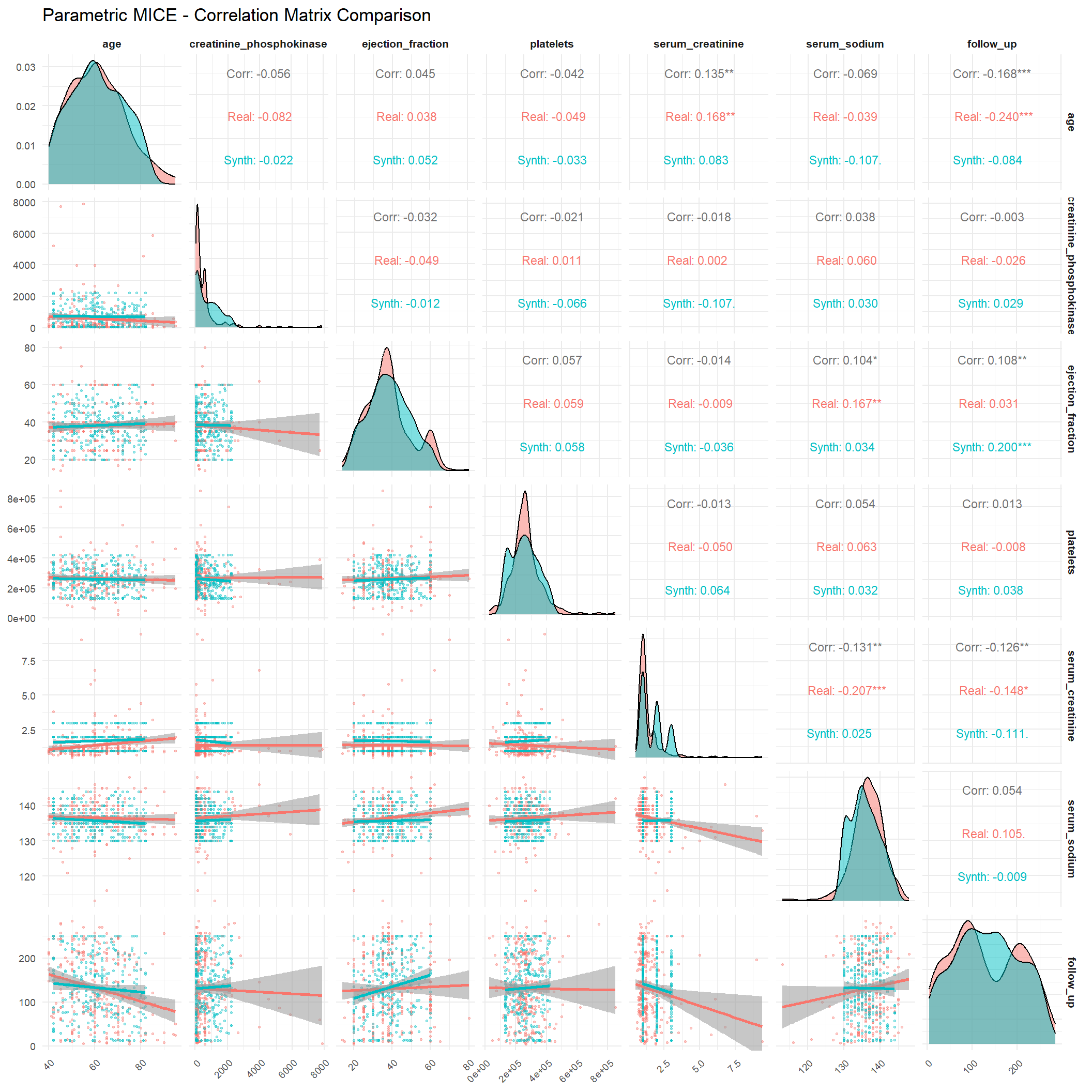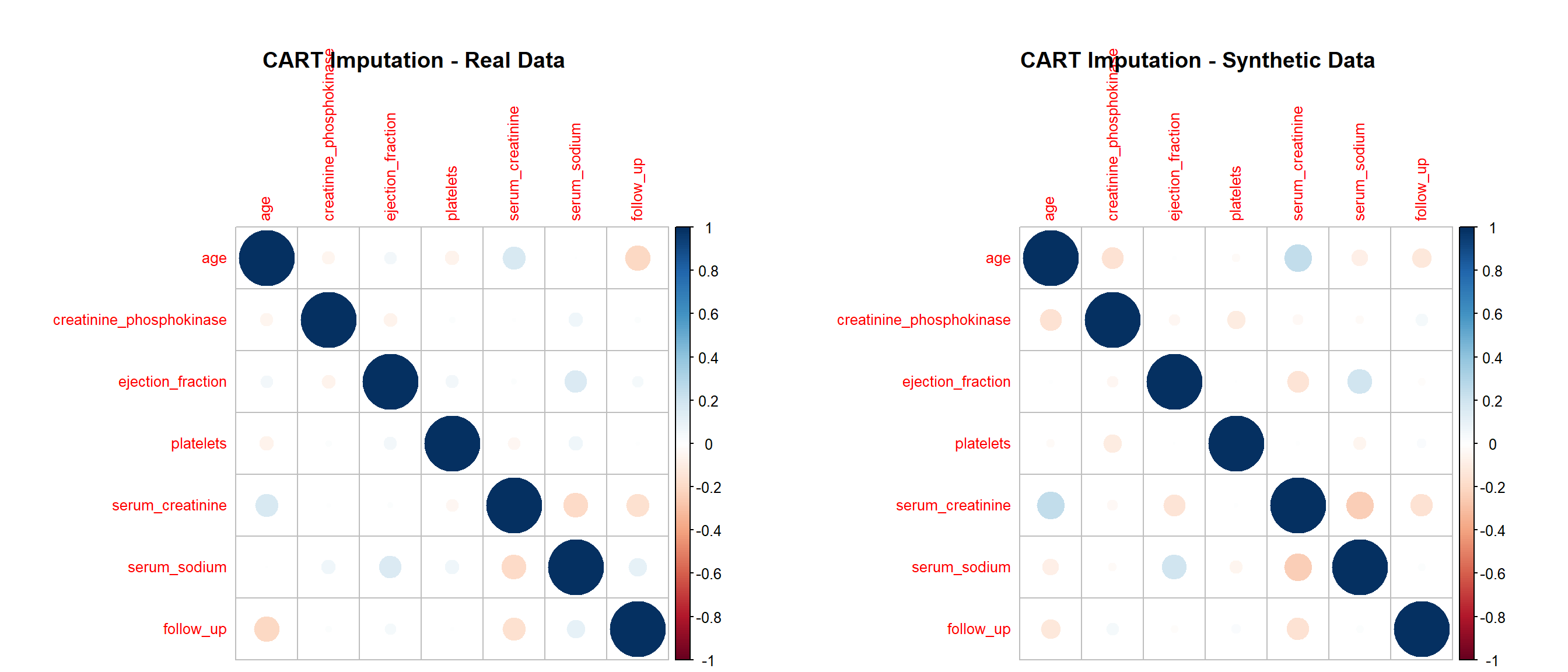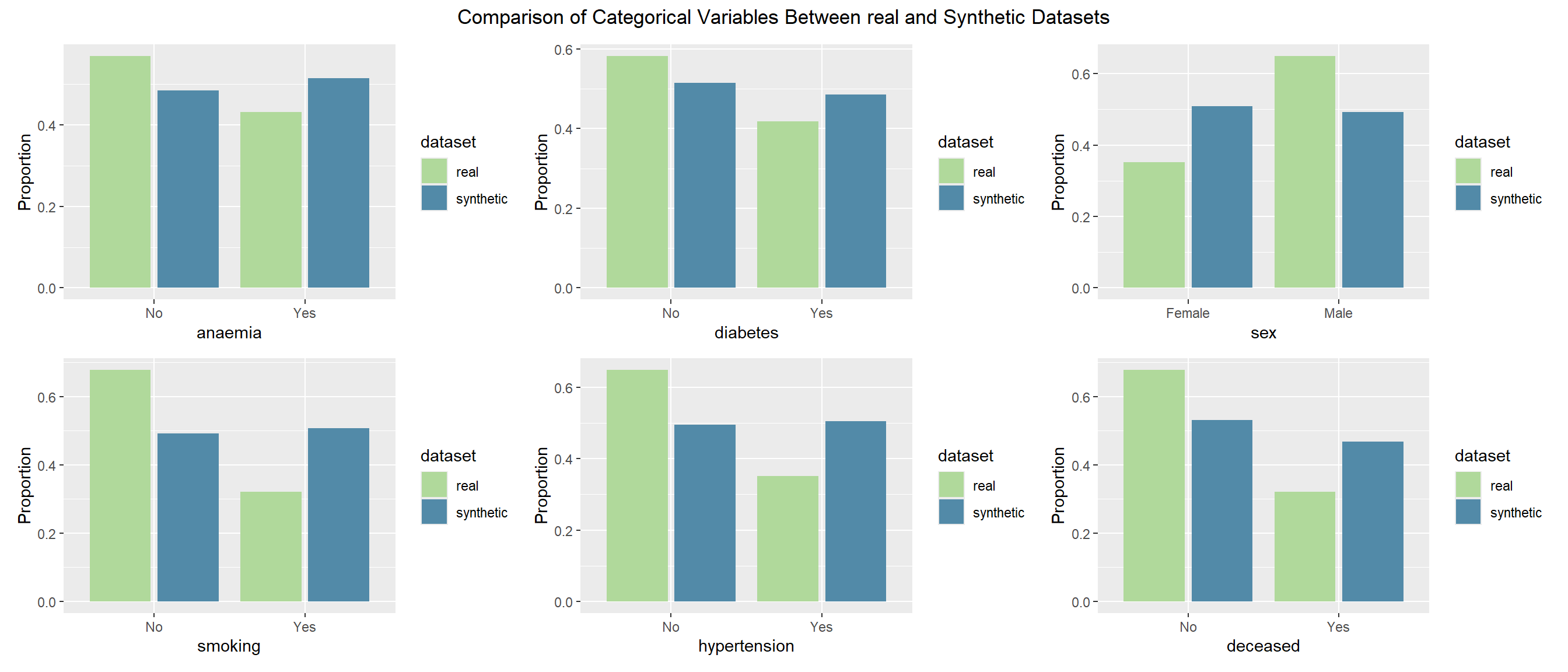This project evaluates the quality of synthetic datasets derived from the Heart Failure Clinical Records data (299 patients, 13 variables). Our goal is to determine how well different generation strategies reproduce the statistical properties and analytic value of the original data while protecting privacy. We generate synthetic data using four approaches: (1) parametric imputation (MICE), (2) non-parametric imputation (CART via MICE), (3) distribution-driven synthesis (synthpop), and (4) metadata-guided rules. We then compare each synthetic dataset with the real data across three dimensions:
