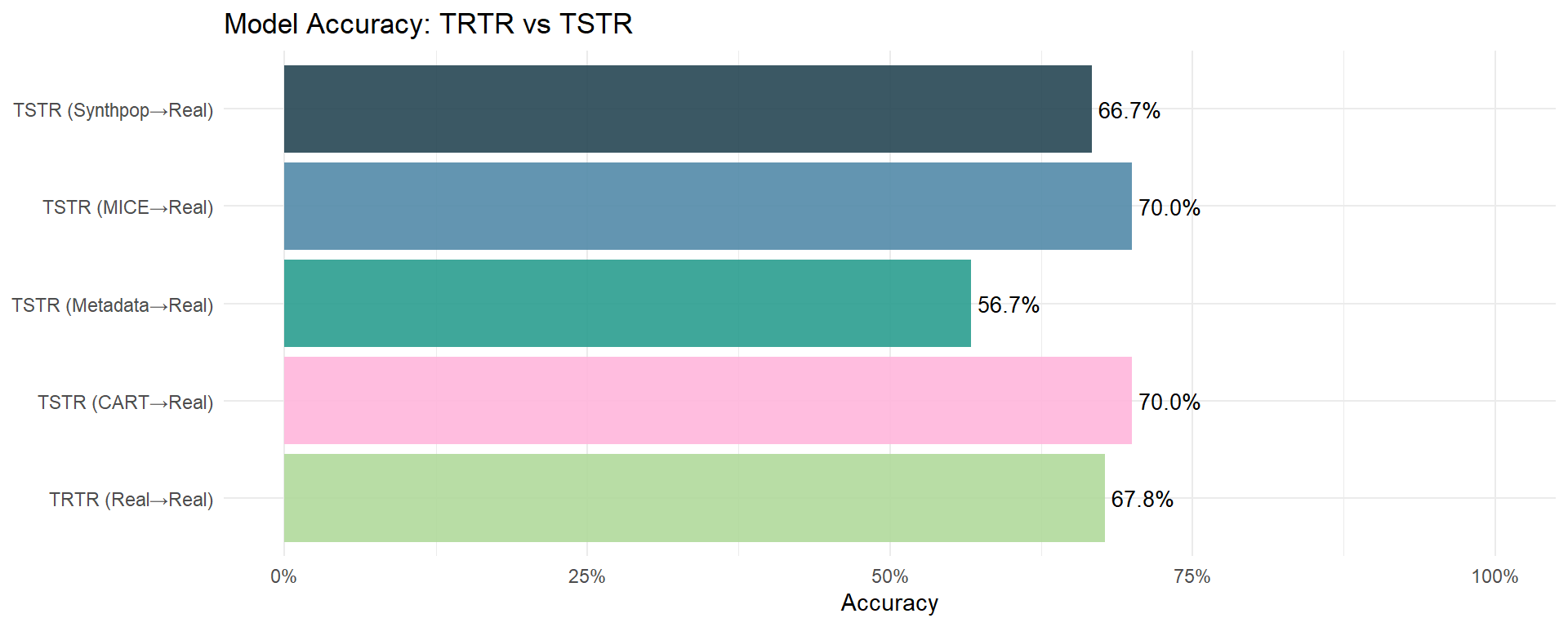 # ---- horizontal Accuracy bar chart ----palette5 <-c("#B0D99B", "#528AA8", "#FFB6DB", "#264653", "#2A9D8F")plot_df <- results %>%mutate(Accuracy_num = readr::parse_number(Accuracy) /100)ggplot(plot_df, aes(y = Dataset, x = Accuracy_num, fill = Dataset)) +geom_col(alpha =0.9, show.legend =FALSE) +geom_text(aes(label = Accuracy), hjust =-0.1, size =3.5) +scale_fill_manual(values =setNames(palette5, unique(plot_df$Dataset))) +scale_x_continuous(labels = scales::percent_format(accuracy =1), limits =c(0, 1)) +labs(title ="Model Accuracy: TRTR vs TSTR", x ="Accuracy", y =NULL) +theme_minimal()
