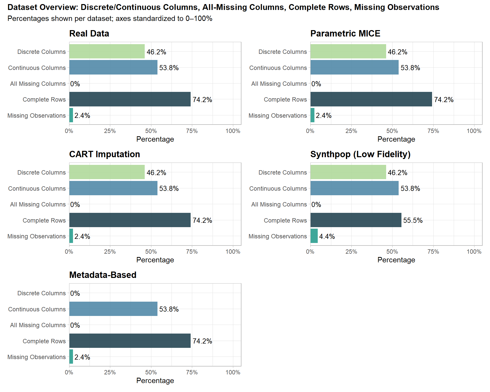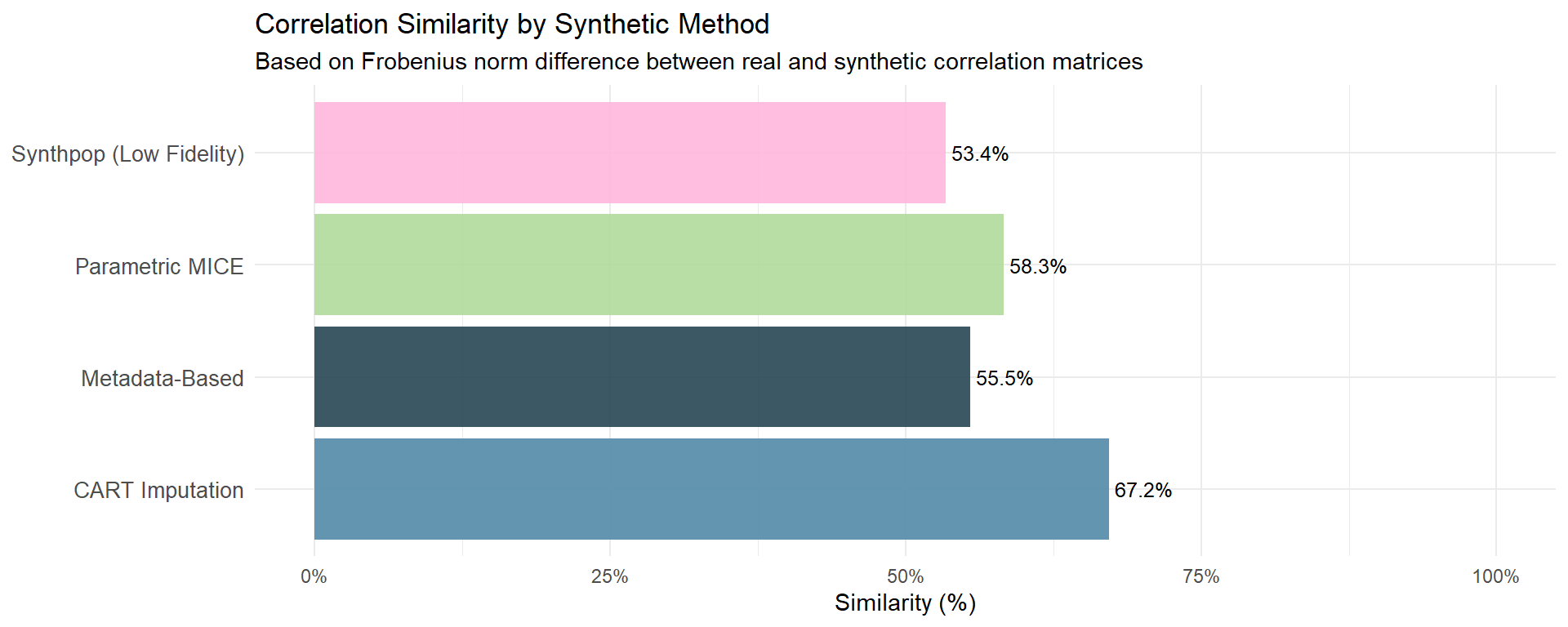 Data Structure Preservation: All methods preserved the structure of the real dataset, though minor variations in variable distributions were observed.