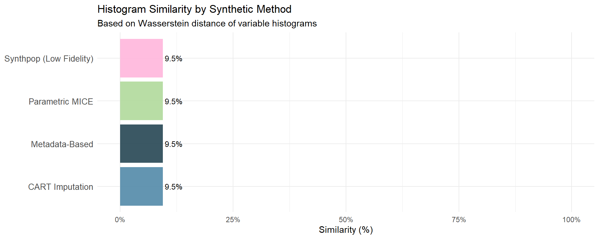 # ---- Plot only if any score > 0 ----if (any(neighbors_tbl$Neighbors_Privacy_Score >0)) { pal <-c("#B0D99B", "#528AA8", "#FFB6DB", "#264653")ggplot(neighbors_tbl, aes(y = Dataset, x = Neighbors_Privacy_Score, fill = Dataset)) +geom_col(alpha =0.9, show.legend =FALSE) +geom_text(aes(label = Neighbors_Privacy_Score), hjust =-0.1, size =3.5) +scale_fill_manual(values = pal[seq_len(nrow(neighbors_tbl))]) +scale_x_continuous(labels = scales::percent_format(accuracy =0.1)) +labs(title ="Neighbors' Privacy Score by Synthetic Method",subtitle ="Lower values mean synthetic records are less likely to be close replicas of real individuals",x ="Privacy Score (Proportion of risky neighbors)", y =NULL ) +theme_minimal()} else {cat("✅ All Neighbors' Privacy Scores are 0. No risky neighbors detected. No plot is generated.\n")}